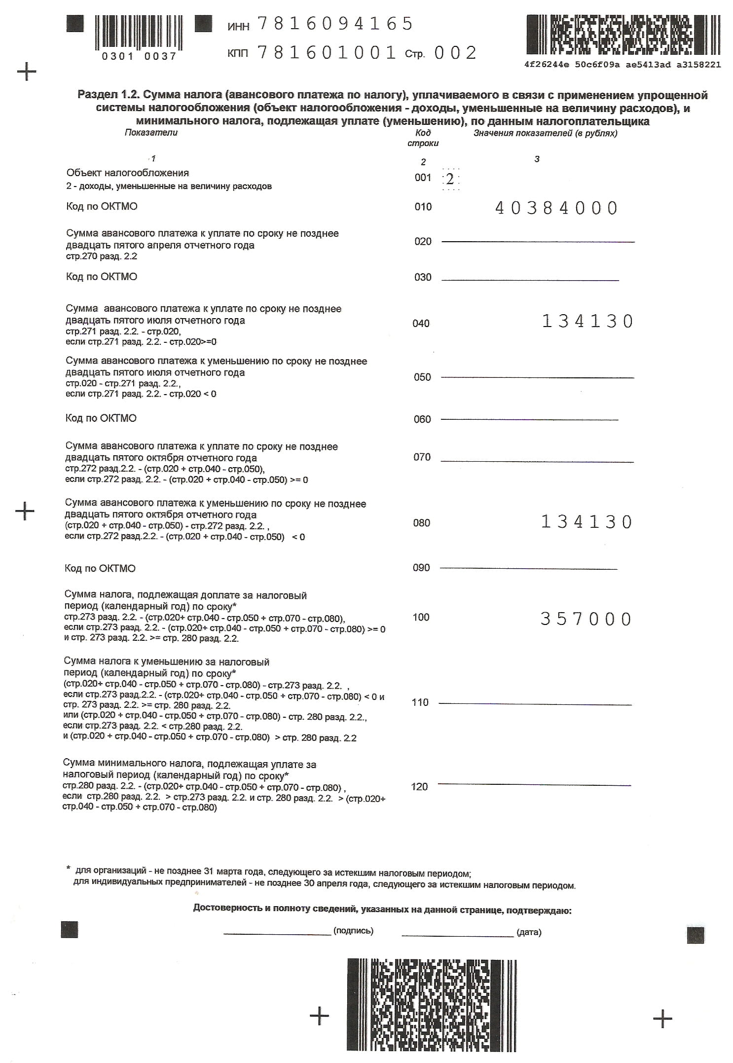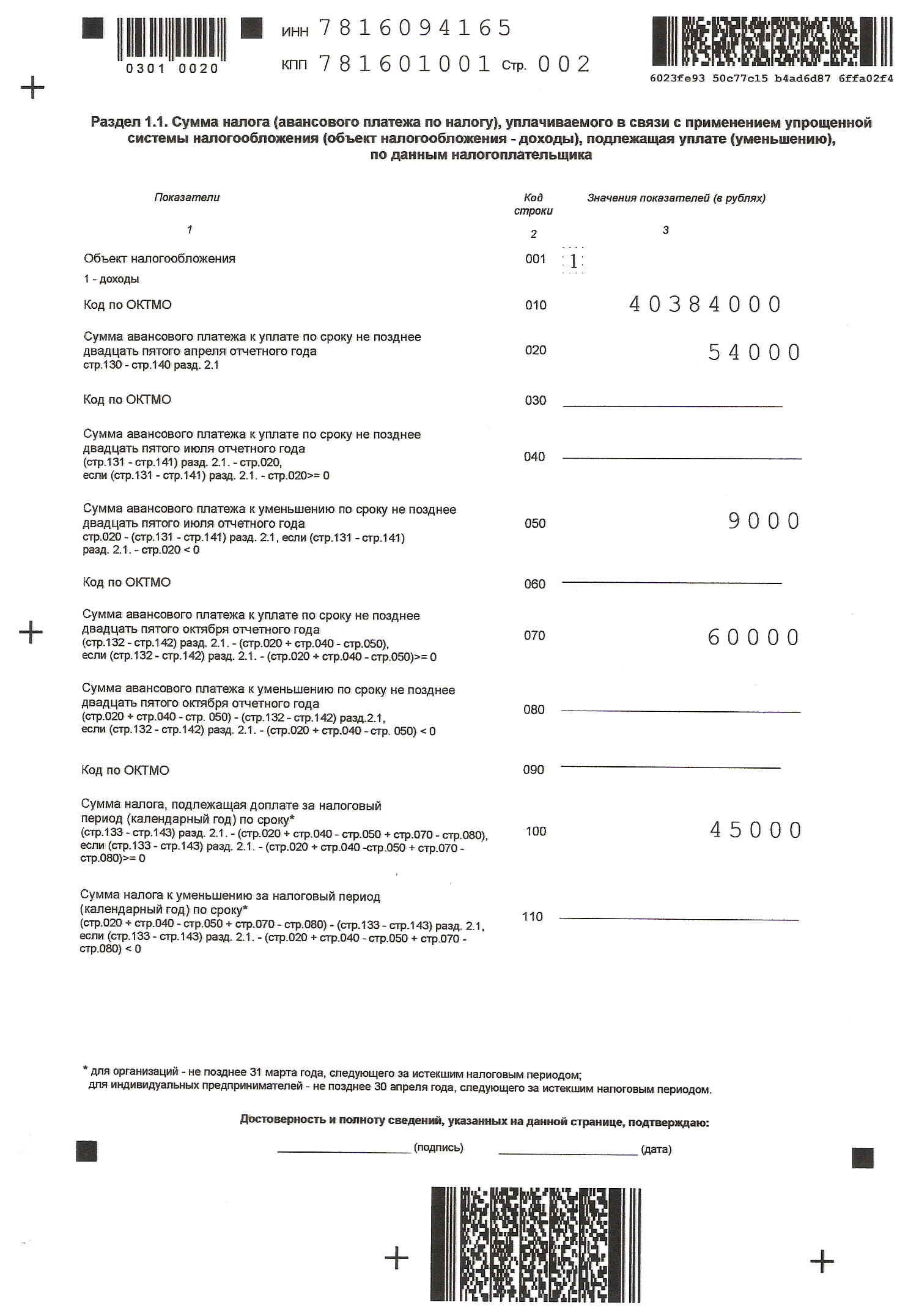 Аналогичным образом рассчитываются авансовые платежи за 9 месяцев и налог за год. Помните, что не всегда цифра в строке 100 означает, что именно эту сумму необходимо доплатить, а в строке 110, что именно эту сумму налоговая вам должна вернуть. Как уже выше писалось, в декларации не указываются уплаченные вами суммы в течение года, а они могут не совпадать с данными раздела 1.1.