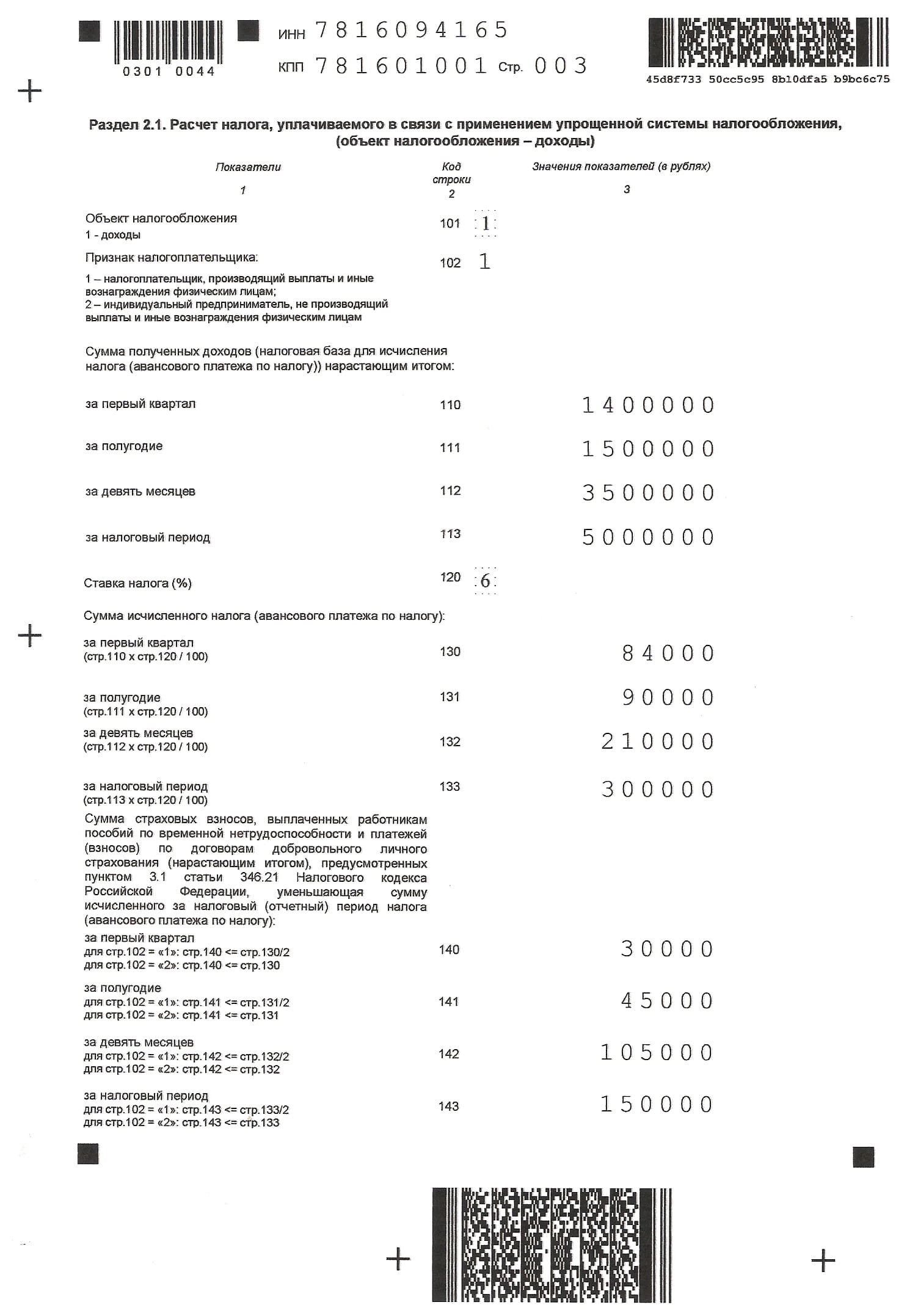Ставка налога в строке 120 составляет обычно составляет 6%. Но может быть и 3% (налогоплательщики Крыма) и даже 0% (ИП, имеющие право на «налоговые каникулы»). Несмотря на то, что ИП, применяющие ставку 0%, налог платить не должны, декларацию представлять в налоговую инспекцию надо.