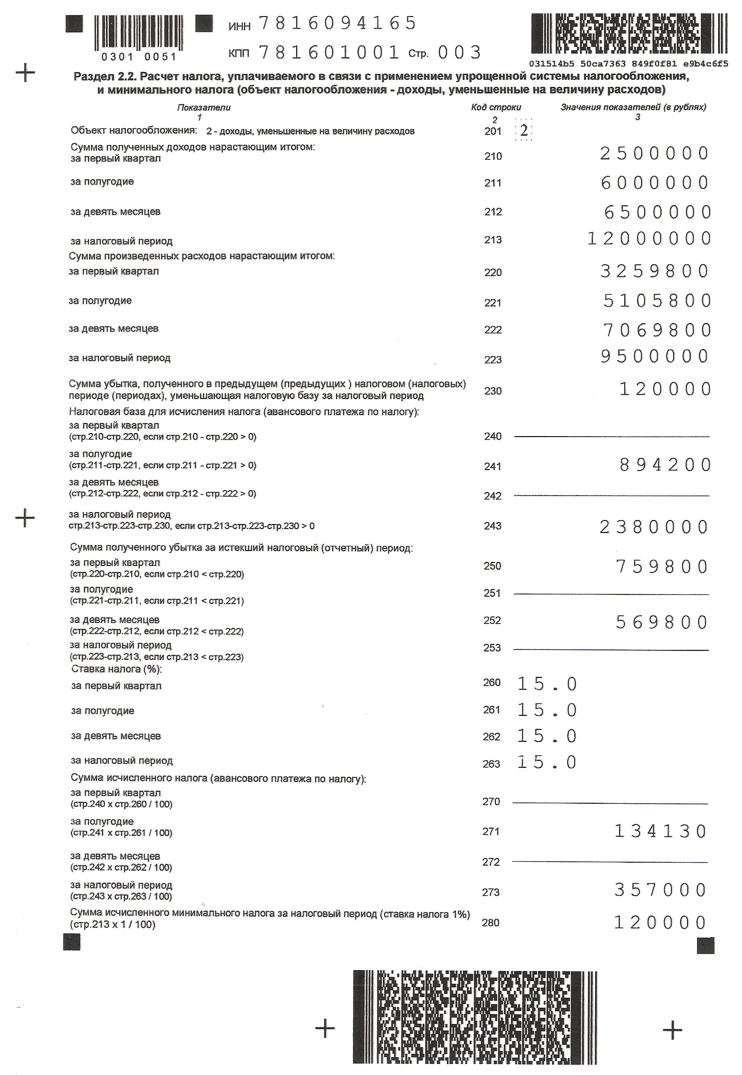 В конце заполнения раздела следует рассчитать минимальный налог, чтобы сравнить его с рассчитанным за год единым налогом. Полученная сумма минимального налога пишется в строке 280.