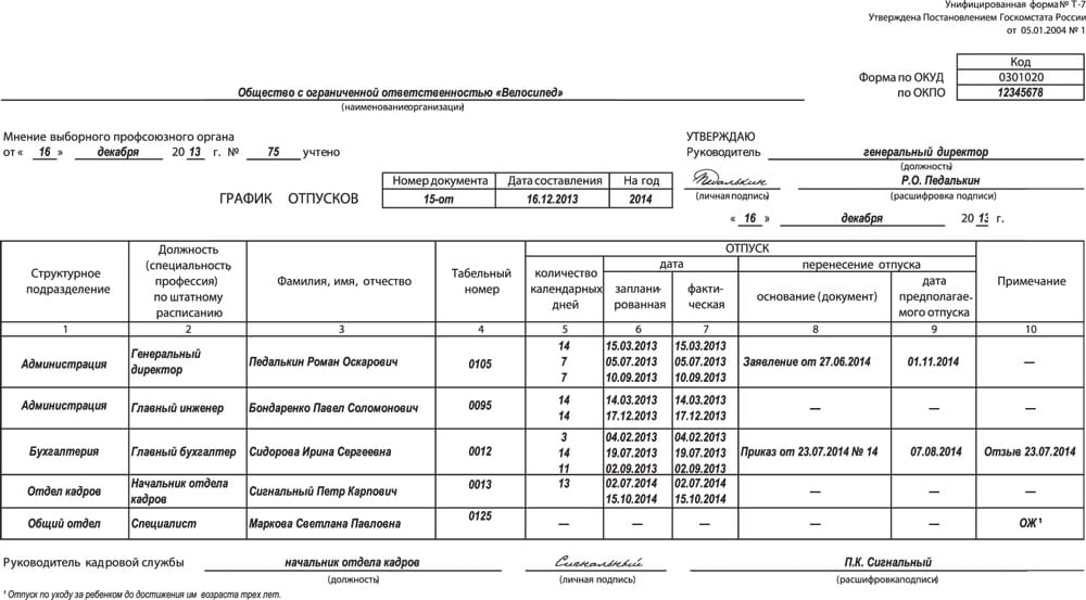График отпусков должен быть подписан начальником кадровой службы и утвержден руководителем.