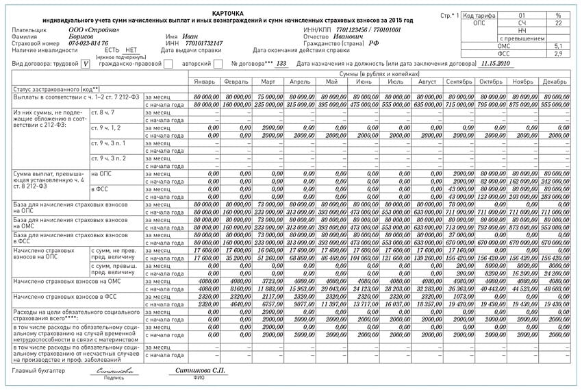 Обязательный учет взносов и расходов на страхование по временной нетрудоспособности и материнству предусмотрен также в пункте 1 статьи 4.8 Федерального закона от 29 декабря 2006 г. № 255-ФЗ. Для этого используют карточку индивидуального учета. Ее прежняя форма была рекомендована в совместном письме ПФР от 26 января 2010 г. № АД-30-24/691, ФСС России от 14 января 2010 г. № 02-03-08/08-56П. Но сейчас она не актуальна, так как в ней всего одна строка для предельной базы по взносам, а с 2015 года лимиты у фондов разные. Кроме того, многие строительные организации платят взносы по дополнительным тарифам в зависимости от классов условий труда, определенных при спецоценке, а в старой форме они не предусмотрены.