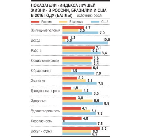 Несмотря на успехи РФ в улучшении качества жизни граждан в последнее десятилетие, по доходам, безопасности, экологии, жилищным условиям и уровню здоровья страна показывает результаты ниже среднего, отмечают эксперты ОЭСР в исследовании «Индекс лучшей жизни-2016». Впрочем, по уровню социальных связей и балансу работы и отдыха показатели у России хорошие.
