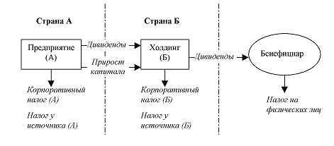 Налогообложение этих доходов, вообще говоря, может происходить и в стране происхождения дохода, и в стране местонахождения холдинга. В стране происхождения дивиденды обычно облагаются налогом у источника выплаты. Прирост капитала облагается у источника не всегда, но, вообще говоря, это возможно.