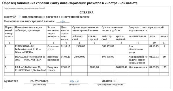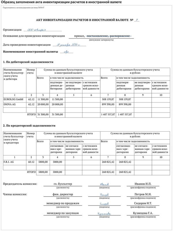 В данном акте должна быть отражена информация по всем иностранным дебиторам и кредиторам, по которым инвентаризировались первичные документы. Он должен быть подписан всеми членами инвентаризационной комиссии.