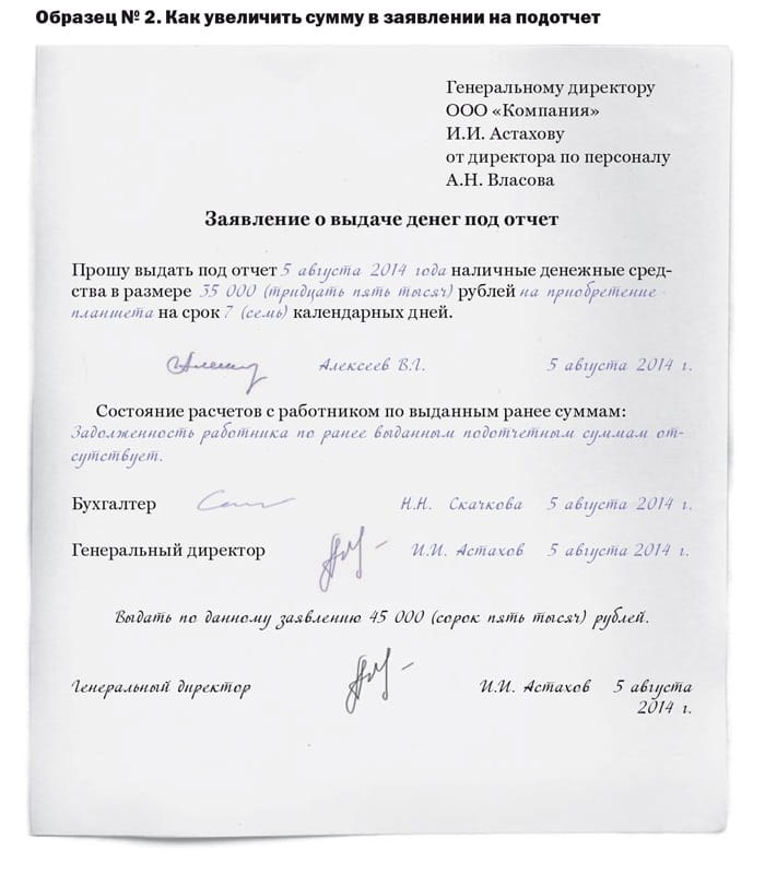 На заявлении о выдаче денег под отчет сотрудник сам может написать сумму и срок, на который он хочет получить деньги, а руководитель лишь подписывает документ (п. 6.3 Указания № 3210-У). Но на практике возможна ситуация, что работник пишет одну сумму, а потом из кассы ему выдают другую по устному требованию директора.