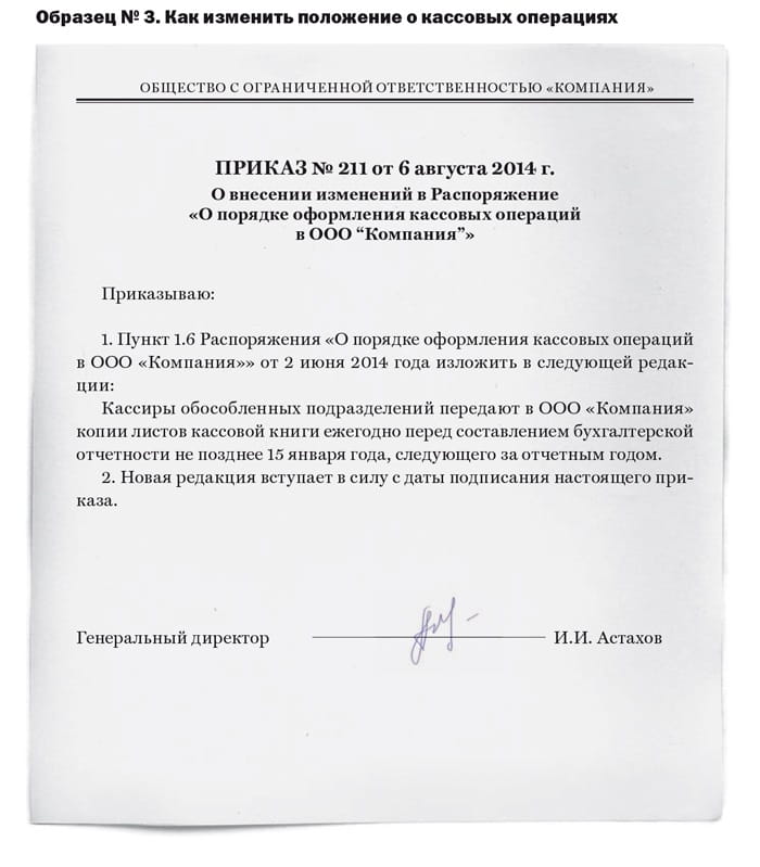 В данном случае исправление ошибок по кассе возможно двумя способами. Можно составить приказ об изменениях с датой от 2 июня 2014 года. Но это не всегда возможно, если у компании строгая нумерация документов. Тогда подойдет второй вариант — оформить приказ об изменениях текущим числом. А за все дни, пока новый порядок не действовал, получить копии кассовой книги от подразделений и хранить их отдельно от кассовой книги головного офиса.