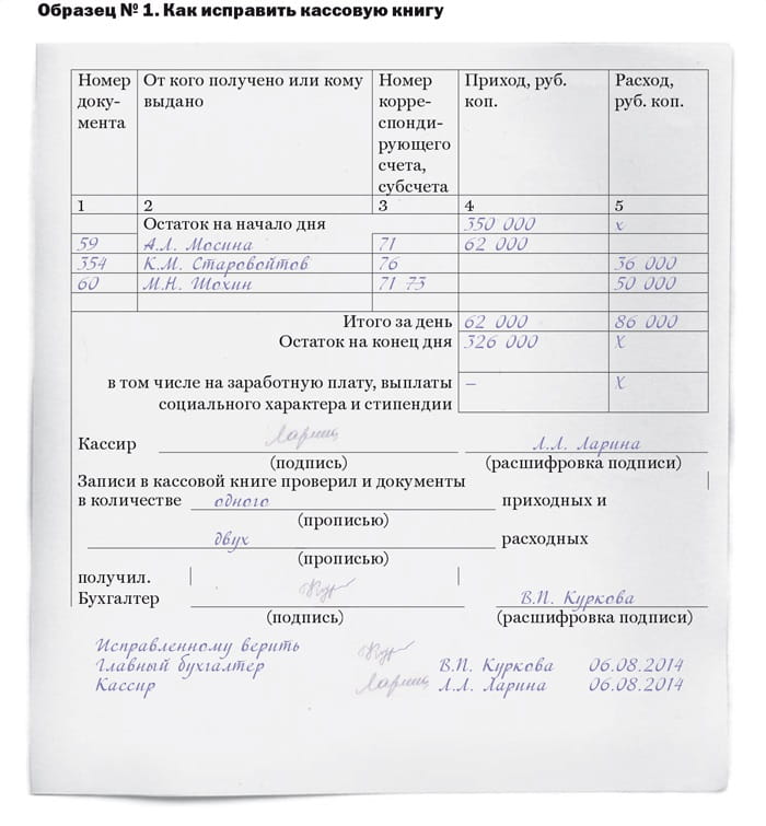 Выдачу займа проще всего переоформить на подотчет. Ведь работники могут получить деньги на эти цели из кассы (п. 5 Указания ЦБ РФ от 11.03.14 № 3210-У). Чтобы исправить документы, сначала надо взять с работника заявление и переоформить расходный кассовый ордер. Чтобы не перепечатывать всю книгу, можно исправить в ней один только номер счета. Для этого неверный номер необходимо зачеркнуть, поставить правильный, дату исправления и заверить правки подписями сотрудников, которые оформили документ с расшифровкой фамилии и инициалов. Затем надо заказать наличку в банке и только после ее получения в кассу оформить приходник на возврат подотчетных и расходник на выдачу займа.