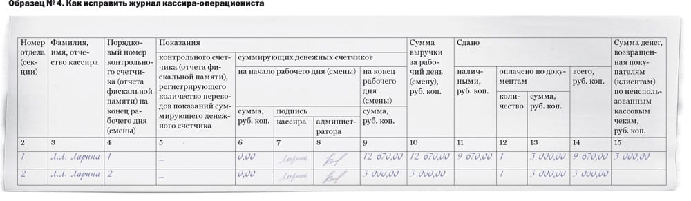 В журнале кассира-операциониста по секции расчетов наличными надо записать всю пробитую выручку с учетом неверного чека. При этом в графе 11 надо отразить, сколько фактически кассир сдал наличных. А неверно пробитую оплату по картам записать в графах 13 и 15. Затем верную сумму расчетов картами надо заполнить в отдельной строке. Впрочем, некоторые налоговики считают, что такие ошибки можно не исправлять. Но безопаснее это сделать, чтобы исключить лишние споры.