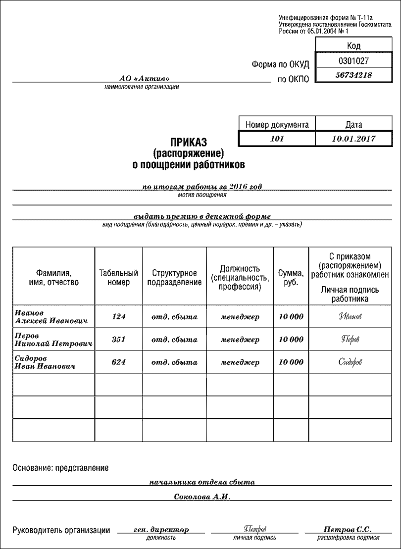 Премии выплачивают на основании приказа руководителя организации. Приказ оформляется по форме № Т-11 (если премия выплачивается одному работнику) или по форме № Т-11а (если премия выплачивается нескольким работникам).
