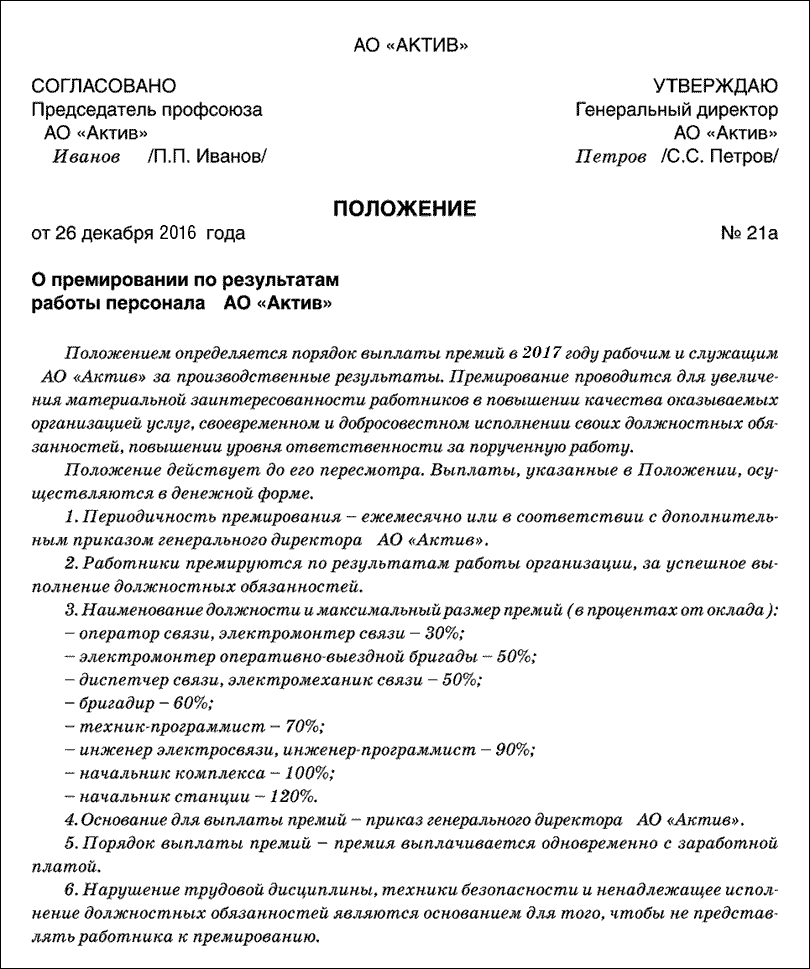 Сумма премии может определяться на основании Положения о премировании, принятого в организации. В Положении о премировании должны быть предусмотрены: