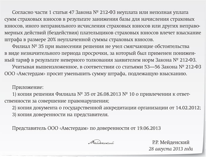 — незначительный период неполной уплаты страховых взносов в связи с неправомерным применением пониженного тарифа из-за неверного толкования компанией норм Закона № 212-ФЗ — постановлением ФАС Северо-Западного округа от 12.03.2013 № А56-27866/2012 снижен размер штрафа, установленный частью 1 статьи 47 Закона № 212-ФЗ.