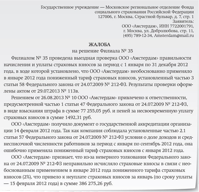 ООО «Амстердам» решило обратиться в вышестоящий орган ФСС РФ с просьбой о снижении размера штрафа по решению территориального отделения фонда. Составим жалобу в вышестоящий орган ФСС РФ.