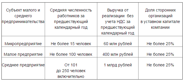 Критерии, по которым компании относят к субъектам малого бизнеса, перечислены в статье 4 Федерального закона от 24.07.2007 № 209-ФЗ «О развитии малого и среднего предпринимательства в Российской Федерации». К субъектам малого предпринимательства относятся компании, которые одновременно отвечает следующим трем условиям: