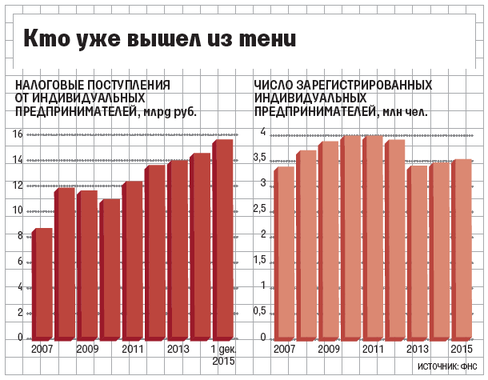 На индивидуальных предпринимателей (ИП) приходится 25% всех доходов бюджета от малого и среднего бизнеса, свидетельствуют данные Минэкономразвития. По данным ФНС, к концу 2015 г. их было зарегистрировано 3,5 млн человек. На порядок больше — около 22,5 млн человек Минтруд называет самозанятыми.