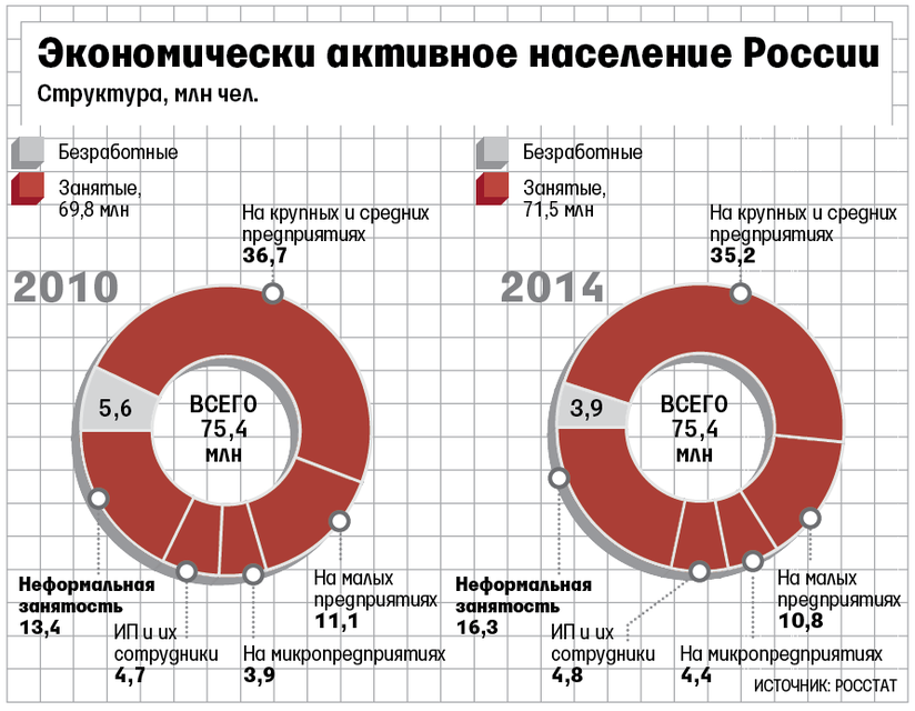 Неформальная занятость в России последовательно росла последние 15 лет — при сокращении рабочих мест в белом секторе экономики. За 2006–2015 гг. число всех занятых в экономике возросло на 3,5 млн человек, или на 5% (до 72,3 млн): примерно на две трети этот рост обусловлен повышением экономической активности населения и на треть — сокращением безработицы. За тот же период занятость на крупных и средних предприятиях сократилась на 5,4 млн человек, или на 13,5% (до 34,7 млн). Неформальный сектор предоставил рабочие места для 8,9 млн человек (рост на 31%), абсорбировав как рост занятости, так и снижение безработицы: и тех, кто вышел на рынок труда в поисках работы, и тех, кто выбыл из формального сектора из-за сокращения там рабочих мест.