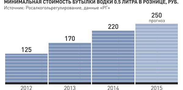 Водку нельзя будет купить дешевле 199 рублей за бутылку объемом в поллитра. А с 1 августа 2014 года минимальная цена на нее будет 220 рублей. Коньяк, бренди и алкоголь из винного, виноградного, плодового, коньячного, кальвадосного и вискового дистиллятов идут по своему пути. Минимальная цена поллитровой бутылки такого алкоголя, кроме коньяка, будет в 2014 году 293 рубля. За коньяк того же объема придется выложить минимум 322 рубля.