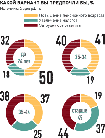 А как относятся к этой идее сами работники? Исследовательский центр портала Superjob решил выяснить, что бы мы предпочли — выходить позже на пенсию или платить более высокие налоги? Оказалось, что сторонников первой идеи почти в 1,5 раза больше, чем вторых. Но в целом 74% опрошенных считают, что срок выхода на пенсию повышать нельзя. Хотя многие люди воспринимают выход на пенсию как трагедию и стремятся работать как можно дольше, и не только из-за денег.