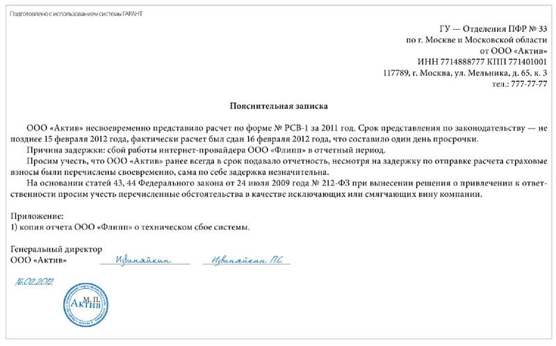 Компании, которая подала расчет РСВ-1 в ПФР с опозданием, лучше приложить к отчетности объяснительную записку.