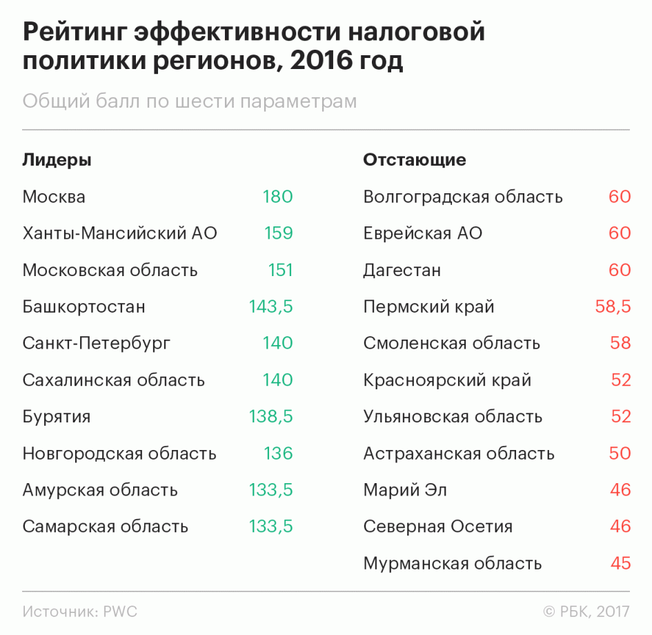 В этом году для расчета рейтинга использовали еще один показатель — «развитие патентной системы налогообложения». Пришлось совершенствовать рейтинг, рассказал РБК один из его составителей, партнер PwC Кирилл Никитин, поскольку большинство регионов уже освоило базовый набор мер налоговой политики. Регионы-лидеры получили высокий балл за уровень развития патентной системы налогообложения и долю применяющих ее предпринимателей, что лишь укрепило их позиции в рейтинге.