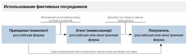 Участниками схемы с использованием фиктивных российских или иностранных посредников являются: принципал (российский налогоплательщик, от имени и за счет которого действует агент), агент (лицо, формально действующее в интересах принципала в рамках агентского или иного аналогичного договора), покупатель (лицо, которое приобретает товары, работы или услуги принципала). Налоговая служба не конкретизирует, кто именно в данном случае заключает договор с покупателем. Возможны два варианта. Первый — агент ищет клиентов и самостоятельно заключает с ними договор от имени принципала. Второй — агент только ищет клиентов, ведет с ними предварительные переговоры, передает информацию принципалу, и последний заключает договор.