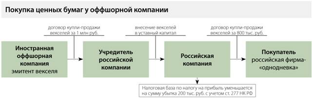 Еще одним способом ведения деятельности с высоким налоговым риском является покупка фирмой через своего учредителя ценных бумаг, выпущенных иностранной оффшорной компанией, которая не ведет ФХД и не имеет активов под обеспечение выпуска. При этом оплата ценных бумаг предусмотрена со значительной рассрочкой, позднее даты их погашения. По мнению налогового ведомства, схема работает следующим образом. После покупки учредитель вносит ценные бумаги в уставный капитал своей фирмы, а она реализует их с убытком другим компаниям (вероятнее всего, однодневкам) ( см. схему «Покупка ценных бумаг у оффшорной компании» (файл scheme_2) ). В состав расходов для целей расчета налога на прибыль включают стоимость ценных бумаг по данным налогового учета передающей стороны. Необоснованная налоговая выгода возникает вследствие уменьшения базы по налогу на прибыль на сумму полученного убытка.