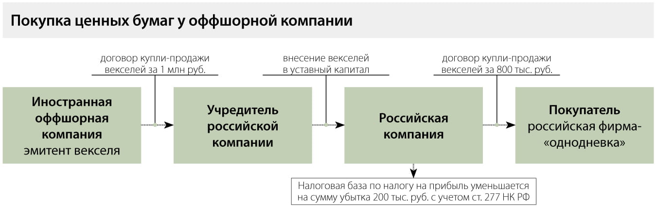 Еще одним способом ведения деятельности с высоким налоговым риском является покупка фирмой через своего учредителя ценных бумаг, выпущенных иностранной оффшорной компанией, которая не ведет ФХД и не имеет активов под обеспечение выпуска. При этом оплата ценных бумаг предусмотрена со значительной рассрочкой, позднее даты их погашения. По мнению налогового ведомства, схема работает следующим образом. После покупки учредитель вносит ценные бумаги в уставный капитал своей фирмы, а она реализует их с убытком другим компаниям (вероятнее всего, однодневкам) ( см. схему «Покупка ценных бумаг у оффшорной компании» (файл scheme_2) ). В состав расходов для целей расчета налога на прибыль включают стоимость ценных бумаг по данным налогового учета передающей стороны. Необоснованная налоговая выгода возникает вследствие уменьшения базы по налогу на прибыль на сумму полученного убытка.