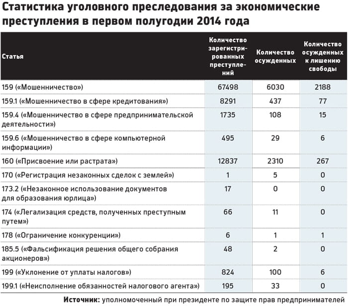 «Статья 159 и ее производные должны войти в проект, так как именно их чаще всего применяют к предпринимателям», — настаивает вице-президент «Деловой России» Андрей Назаров. По статье 159.4 режим следствия менее жесткий, чем по другим статьям, — бизнесменов не арестовывают до вынесения приговора суда, но в 99% случаев следователи не признают предпринимателей за таковых, соглашается первый вице-президент «Опоры России» Павел Сигал.