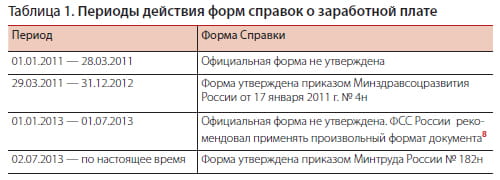 При заполнении справки о сумме заработка необходимо использовать форму, установленную госорганами7. Учитывая несвоевременное утверждение форматов справок, напомним периоды их действия (см. таблицу 1).