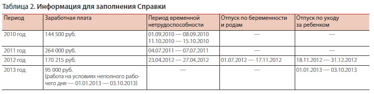 Заполним справку о сумме заработной платы на бухгалтера компании «Тик-так» Е.В. Смирнову при условии, что период работы в организации: с 01.07.2010 по 03.10.2013. Информация о зарплате, периодах болезни и декретном отпуске работника представлена в таблице 2.