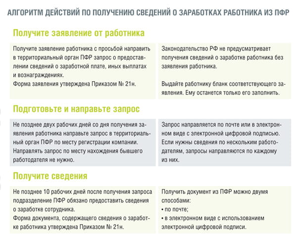 Для расчета пособия по нетрудоспособности бухгалтеру, к сожалению, не обойтись без сведений о заработке сотрудника за период его работы в другой фирме (ст. 13 Закона № 255-ФЗ 1 ). Если получить сведения от самого работника невозможно, то потребуется обратиться в ПФР, направить туда запрос. Для этого имеет смысл придерживаться специальной процедуры, установленной Приказом № 21н 3 . Приведем алгоритм действий.