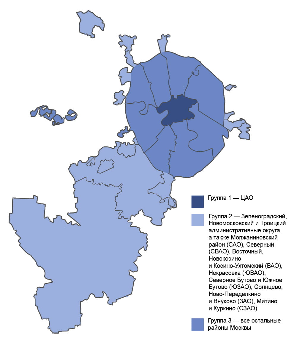 - группа 2 — районы, входящие в Зеленоградский, Новомосковский и Троицкий административные округа, а также Молжаниновский район (САО), Северный (СВАО), Восточный, Новокосино и Косино-Ухтомский (ВАО), Некрасовка (ЮВАО), Северное Бутово и Южное Бутово (ЮЗАО), Солнцево, Ново-Переделкино и Внуково (ЗАО), Митино и Куркино (СЗАО);