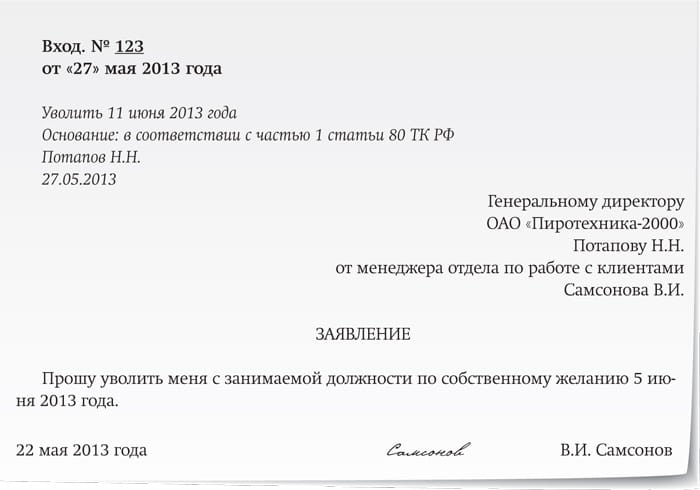 Течение двухнедельного срока предупреждения об увольнении у В.И. Самсонова начнется с 28 мая и закончится 11 июня 2013 года (в последний день отпуска). Если работодатель не согласен с датой увольнения, указанной в заявлении работника (5 июня 2012 года), на заявлении В.И. Самсонова он поставит резолюцию, в которой укажет дату увольнения, равную истечению двухнедельного срока предупреждения, и обоснование — часть 1 статьи 80 ТК РФ. Например: «Уволить 11 июня 2013 года в соответствии с частью 1 статьи 80 ТК РФ». 11 июня 2013 года сотрудник может прийти ознакомиться с приказом, забрать заполненную трудовую книжку, получить полный расчет.