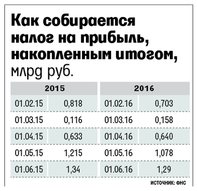Резкого сокращения прибыли у компаний в 2016 г. не было, согласен сотрудник одной из госкомпаний. В начале года сальдированный финансовый результат компаний (прибыль минус убытки, без малого бизнеса, банков, страховых организаций и бюджетных учреждений) был лучше, чем в 2015 г., благодаря девальвационной прибыли. Но постепенно она проедалась, и за пять месяцев, по данным Росстата, сальдо оказалось ниже на 7,8%, а прибыль — на 3,7% (4,317 трлн и 5,220 трлн руб. соответственно). За пять месяцев 2016 г. поступления налога на прибыль сократились, по данным ФНС, на 4% (см. график).