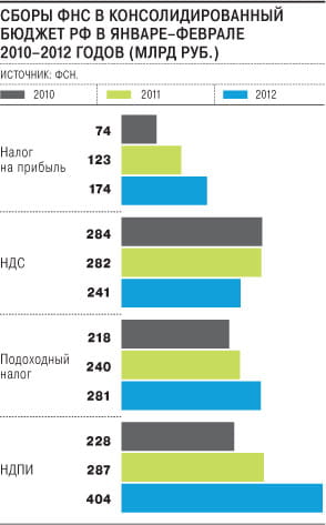 Согласно данным Федеральной налоговой службы (ФНС), в январе-феврале 2012 года в консолидированный бюджет РФ поступило 1,316 трлн руб.— это на 19% больше, чем было в первые два месяца 2011 года. В федеральный бюджет из этой суммы налоговиками собрано 734 млрд руб., в региональные — 582 млрд руб. В основном (на 84%) сумма поступлений начала 2012 года сложилась за счет четырех налогов — это НДС (241 млрд руб.), НДПИ (404 млрд руб.), налог на доходы физических лиц (281 млрд руб.) и налог на прибыль (174 млрд руб.). НДС и НДПИ составляют основу федерального бюджета, подоходный налог и налог на прибыль — региональных.